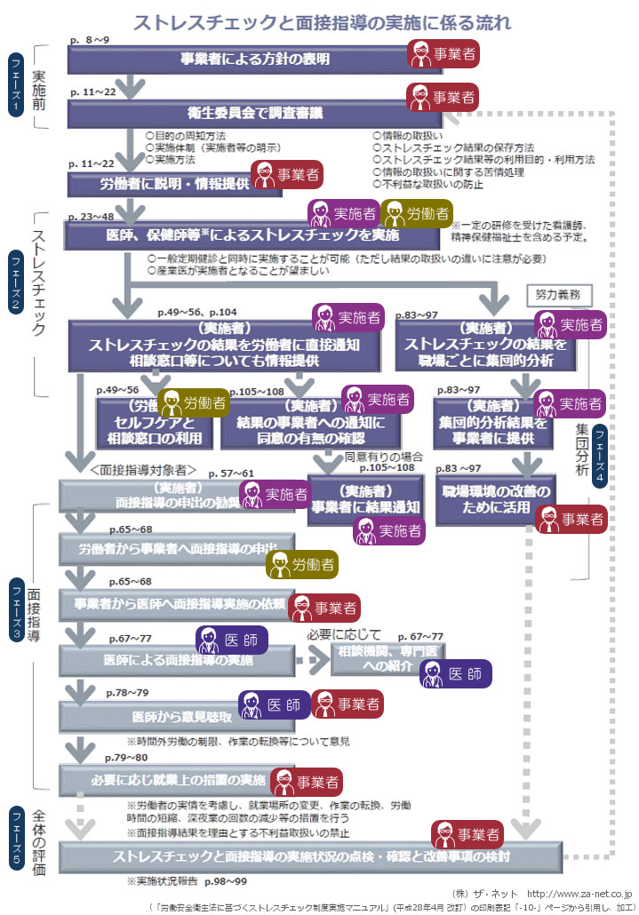 各内容に応じて役割分担があります。まずは各事業所において制度を推進する中心となる担当者さんを決めます。一人で全てを行うことは困難なので社内体制を組みます。連携が必要な産業医等との連絡・調整や、従業員さんへの周知、ストレスチェック後の職場改善企画、労働基準監督署への報告等、こなすべき作業は多岐に渡ります。