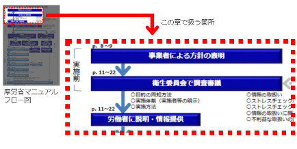 衛生委員会等による調査・審議の成果物としての、社内規程の例が厚労省マニュアルに掲載されていますので、完成イメージとして一度目を通して見ることをお勧めします(印刷表記「-16-」~「-22-」)。上記の①~⑪までの項目について具体的にどのような検討を行わなければならないのか、イメージできると思います。